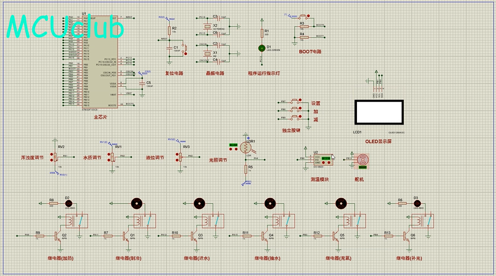 7、通过按键可设置各阈值,另外,可通过按键手动控制加热、降温、换水、投喂、充氧、补光、加水