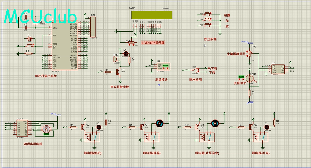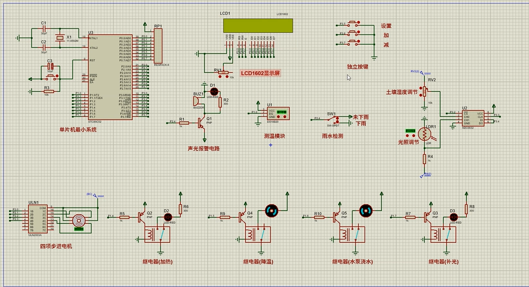3、通过光照检测模块检测光照值,当光照值小于设置最小值时,进行补光;当光照值大于设置最大值时,自动打开遮雨棚进行遮光(四相步进电机模拟)