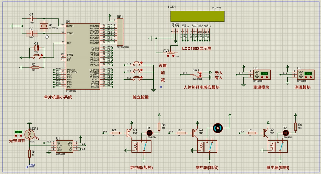 1、通过DS18B20检测环境温度,通过另一个DS18B20检测镜子温度,当开启防雾模式时,温差超过2摄氏度,自动加热或制冷浴室镜,从而防止镜子起雾