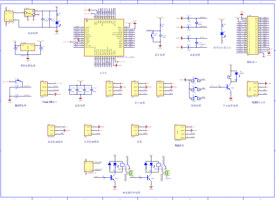 PCB图是由原理图导出,封装很大一部分都是作者自己绘制,不提供封装库,只提供连接好的源文件,可以直接在嘉立创进行打板。两层板,上下覆铜接地。