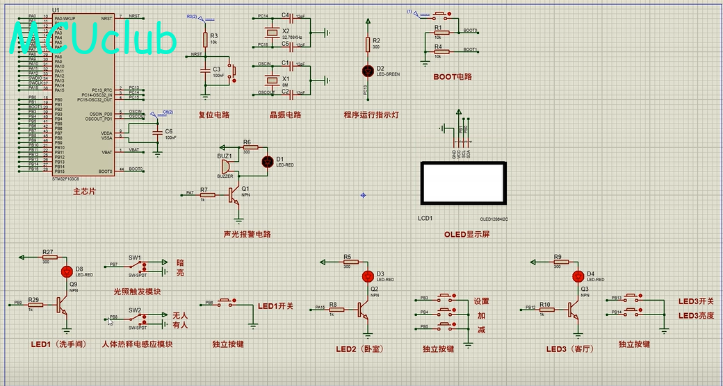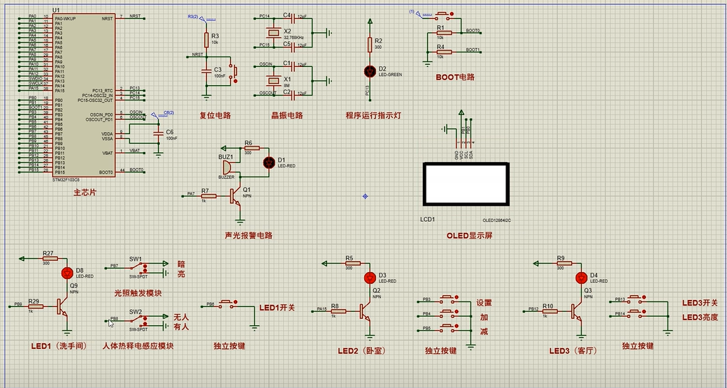 1、通过3个LED灯模拟三个房间的灯(洗手间、客厅、卧室)