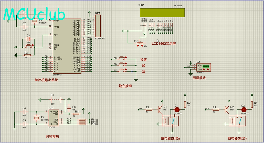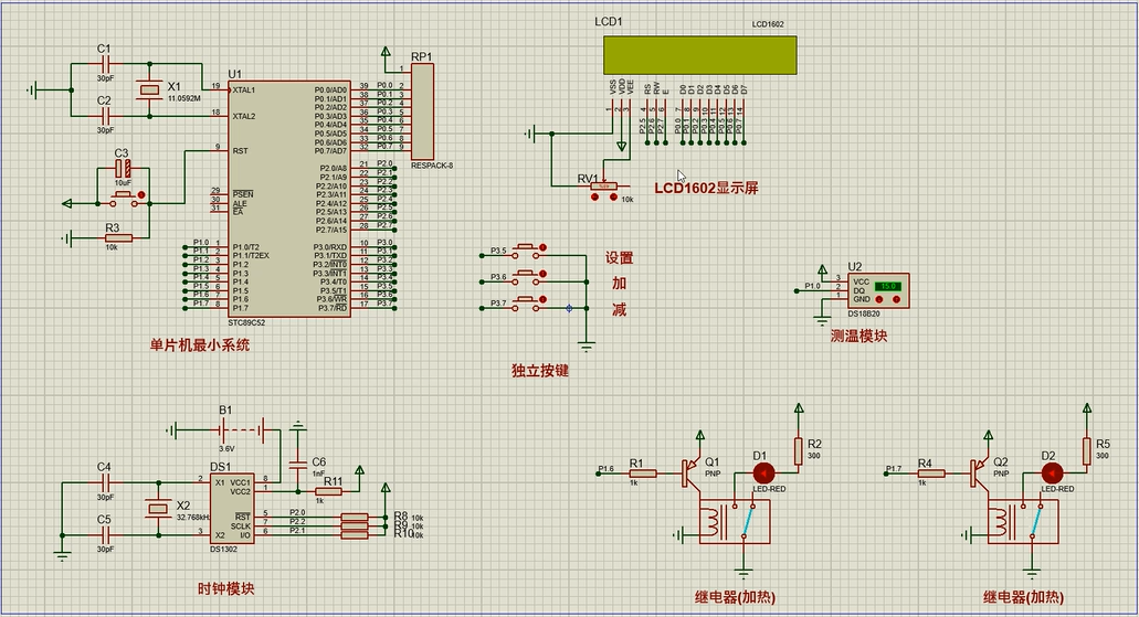 1、通过DS1302同步时间,可通过按键修正时间,另外,可设定自动开电热毯时间和关电热毯时间,此外,也可通过按键开关电热毯