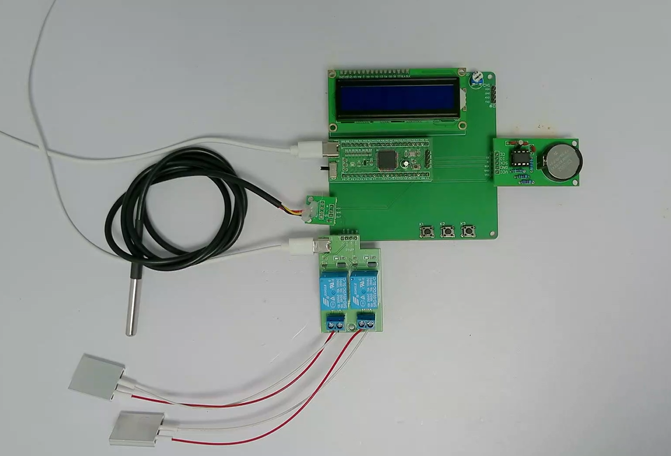 2、通过防水式DS18B20进行测温,当开启电热毯时,如果温度低于设置的最小值,通过两个加热片进行工作(此时为加热模式),直到加热到温度的最大值,此时关闭一个加热片(此时为保温模式)