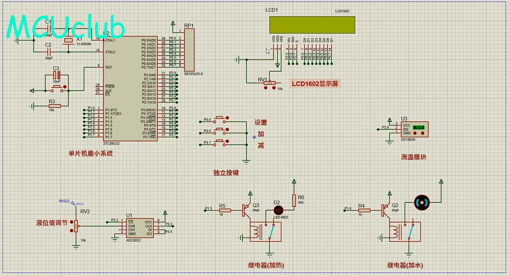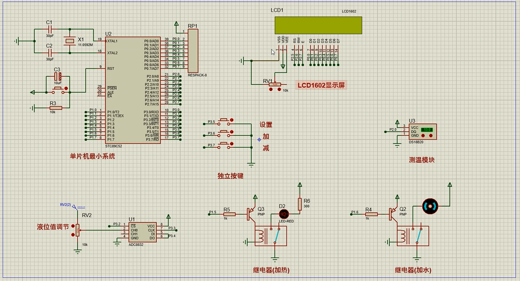 1、通过防水式DS18B20采集水温,当水温小于设置最小值,则进行加热,直到加到最大值