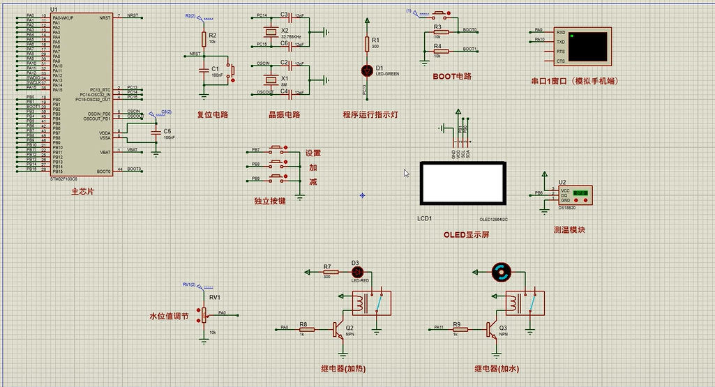 3、通过按键设置各阈值,可手动控制加热或加水