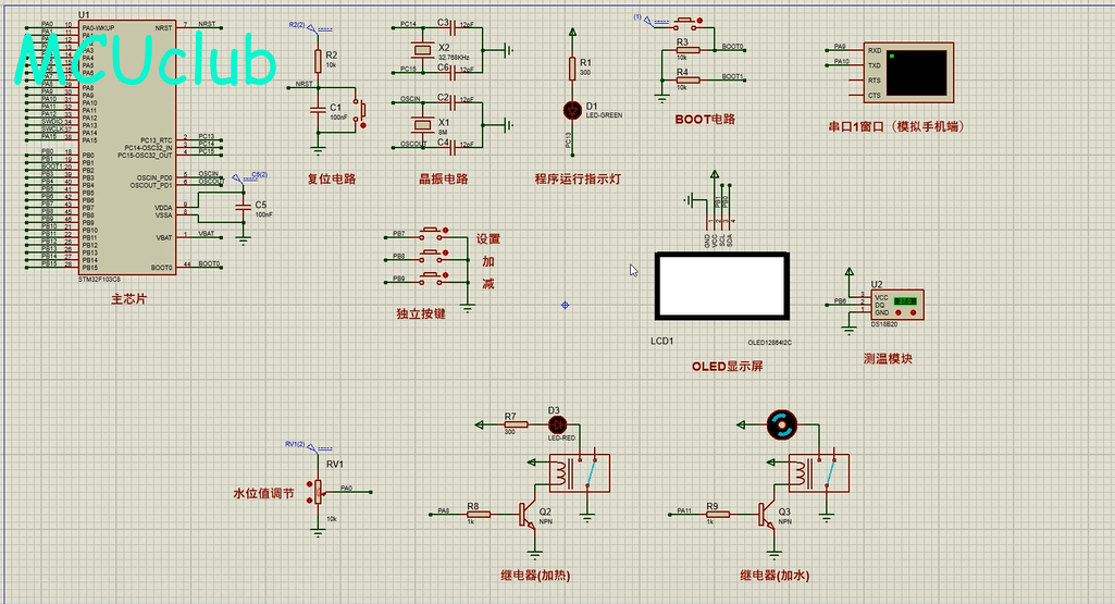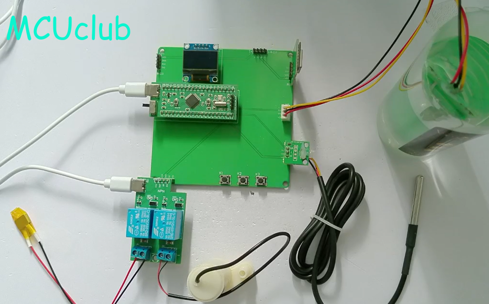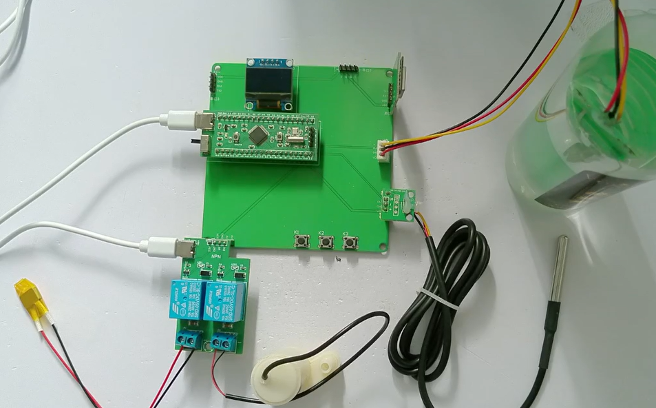 1、通过防水式DS18B20采集水温,当水温小于设置最小值,则进行加热,直到加到最大值