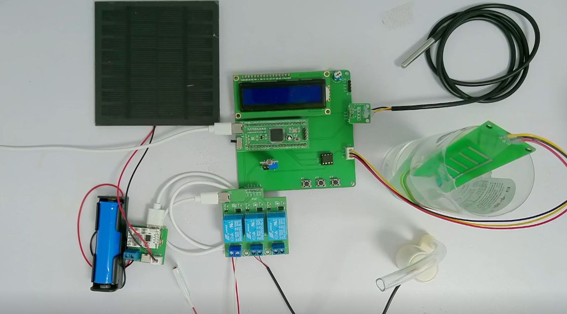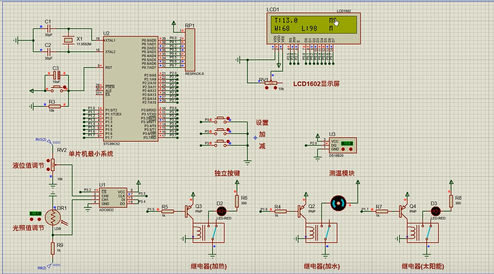 1、通过防水式DS18B20采集水温,当水温小于设置最小值,则进行加热,直到加到最大值