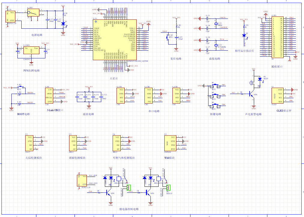 PCB图是由原理图导出,封装很大一部分都是作者自己绘制,不提供封装库,只提供连接好的源文件,可以直接在嘉立创进行打板。两层板,上下覆铜接地。