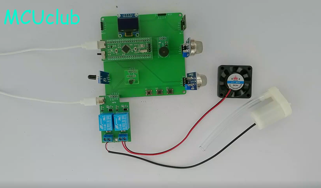 2、通过MQ-2检测烟雾浓度,如果烟雾值大于设置的最大值,通过继电器控制风扇通风,并声光报警