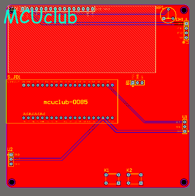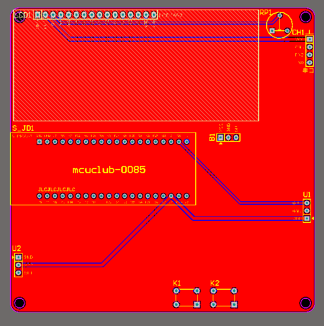 PCB图是由原理图导出,封装很大一部分都是作者自己绘制,不提供封装库,只提供连接好的源文件,可以直接在嘉立创进行打板。两层板,上下覆铜接地。