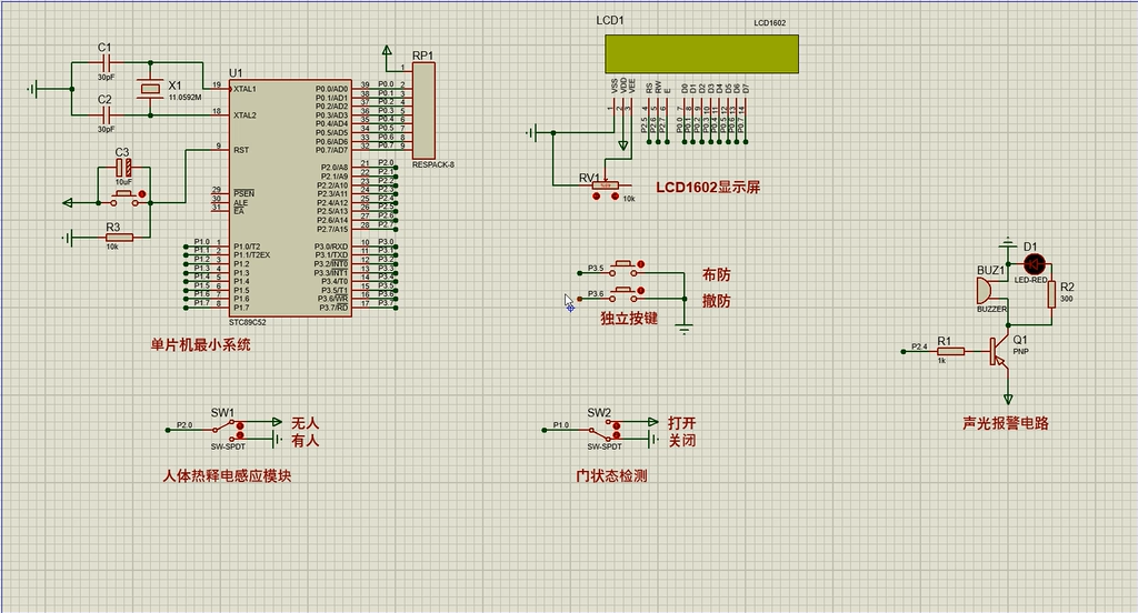 1、通过人体热释电模块监测监控区域是否有人,当有人,并且布防时,则声光警报