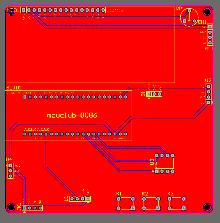PCB图是由原理图导出,封装很大一部分都是作者自己绘制,不提供封装库,只提供连接好的源文件,可以直接在嘉立创进行打板。两层板,上下覆铜接地。