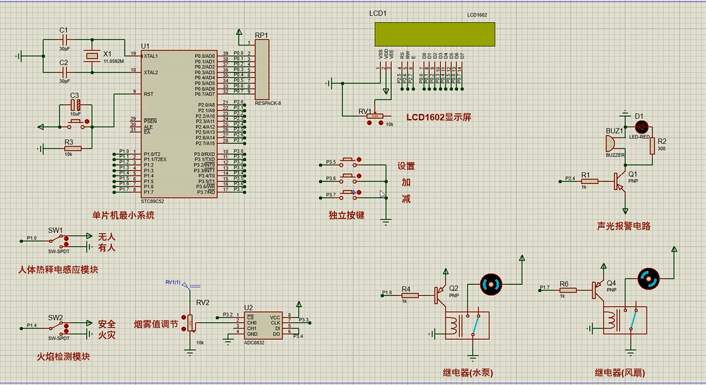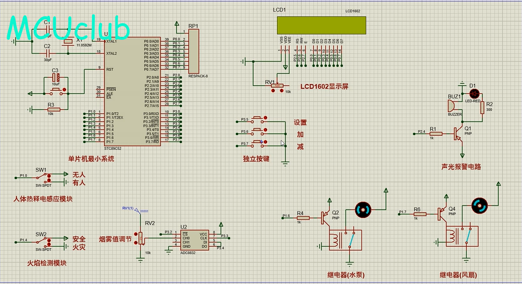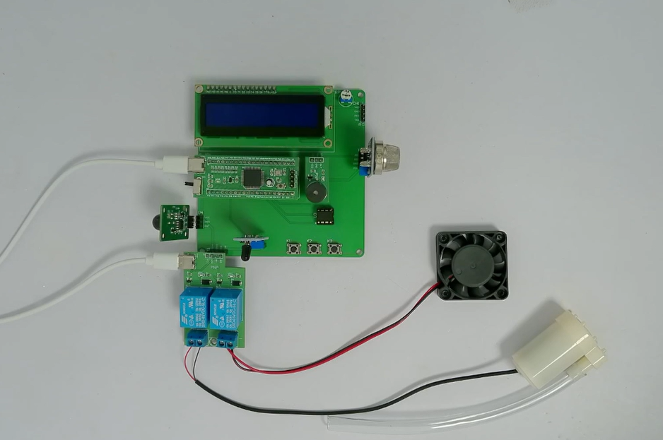 2、通过MQ-2检测烟雾浓度,如果烟雾值大于设置的最大值,通过继电器控制风扇通风,并声光报警