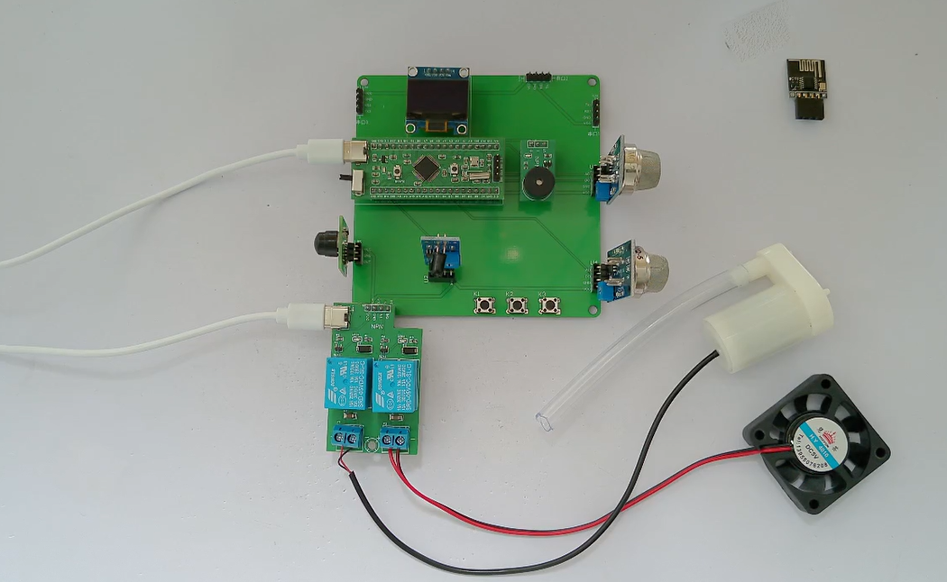 3、通过MQ-5检测当前可燃气体浓度,如果气体浓度大于设置最大值,通过继电器控制风扇通风,并声光报警