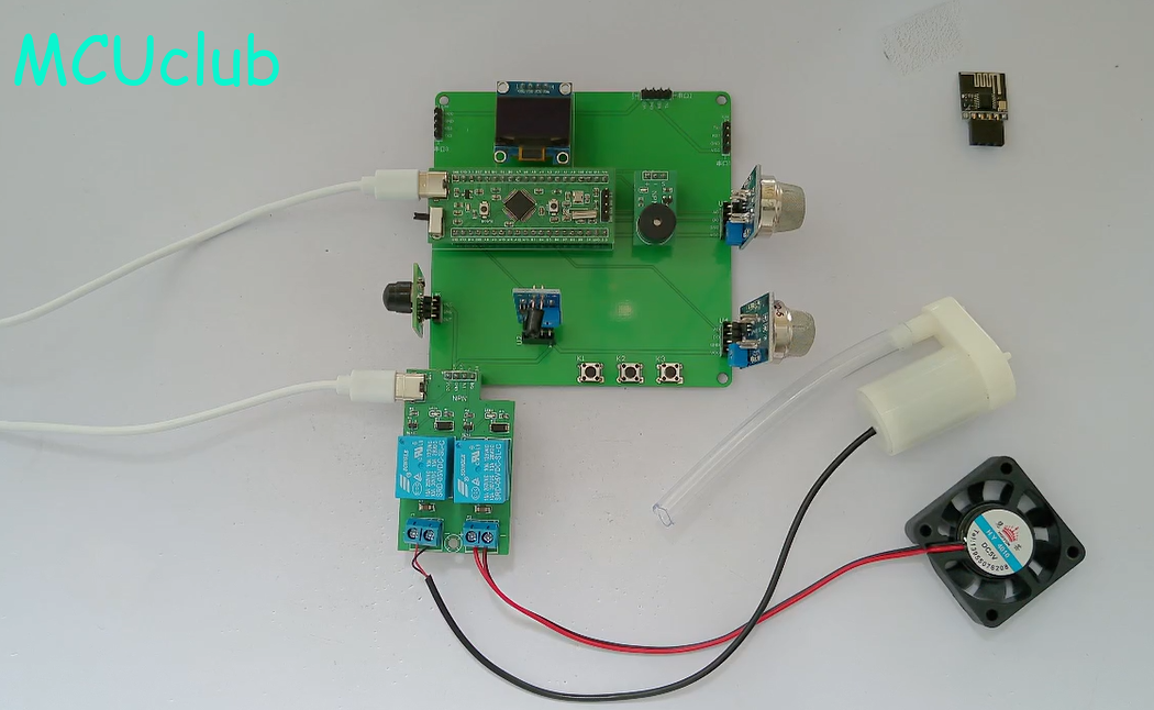2、通过MQ-2检测烟雾浓度,如果烟雾值大于设置的最大值,通过继电器控制风扇通风,并声光报警