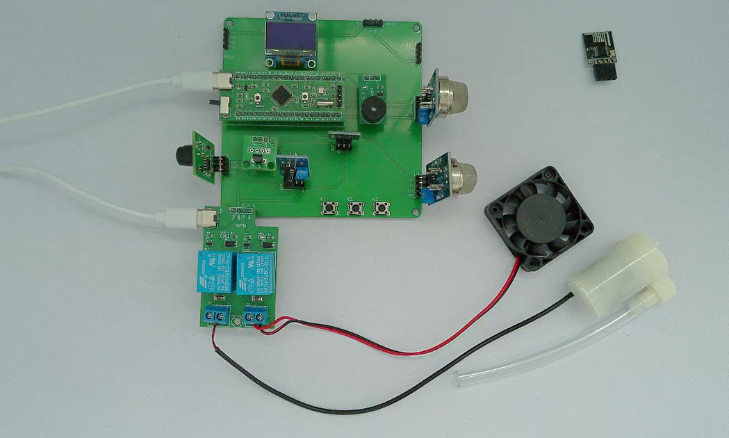 2、通过MQ-2检测烟雾浓度,如果烟雾值大于设置的最大值,通过继电器控制风扇通风,并声光报警