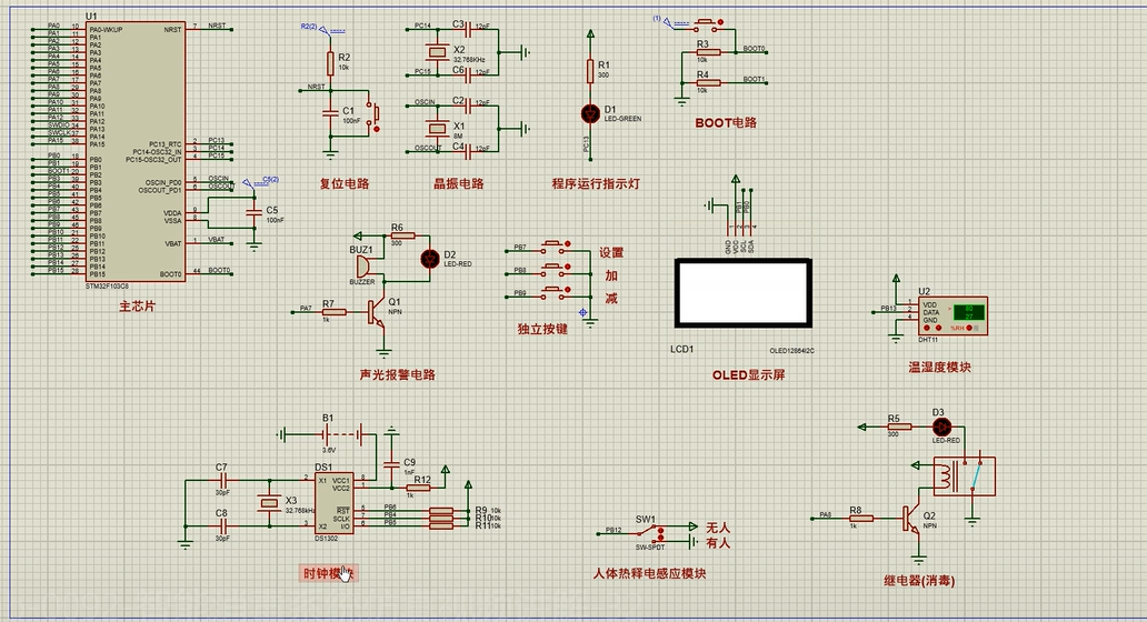 3、通过按键设置消毒的时间区间,当时间在设定的时间区内并且没有人时,开启消毒,否则关闭消毒