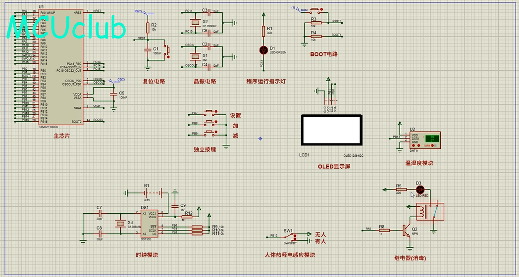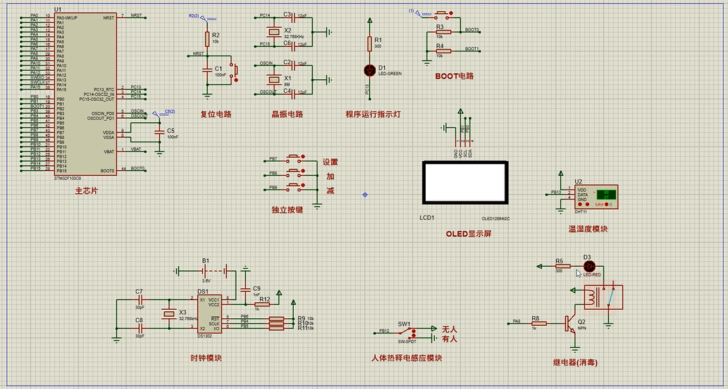 3、通过按键设置消毒的时间区间,当时间在设定的时间区内并且没有人时,开启消毒,否则关闭消毒