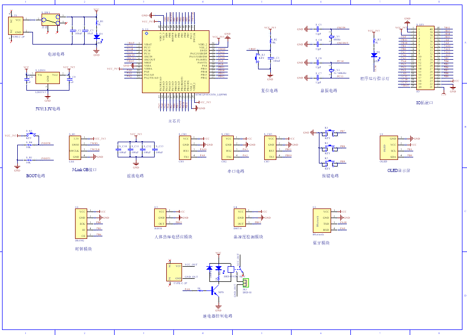 PCB图是由原理图导出,封装很大一部分都是作者自己绘制,不提供封装库,只提供连接好的源文件,可以直接在嘉立创进行打板。两层板,上下覆铜接地。