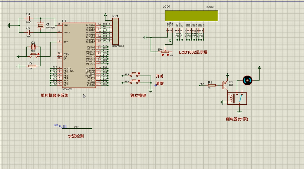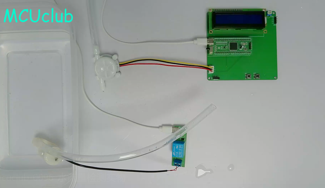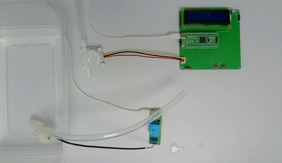 1、通过继电器控制水泵,将水抽出经过流速传感器测出流速,并得出总水流量