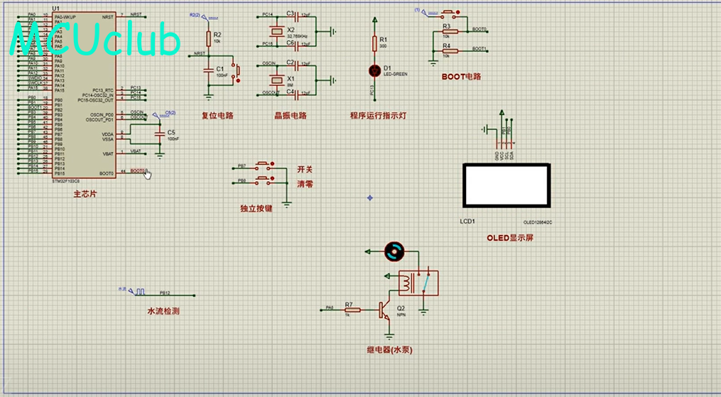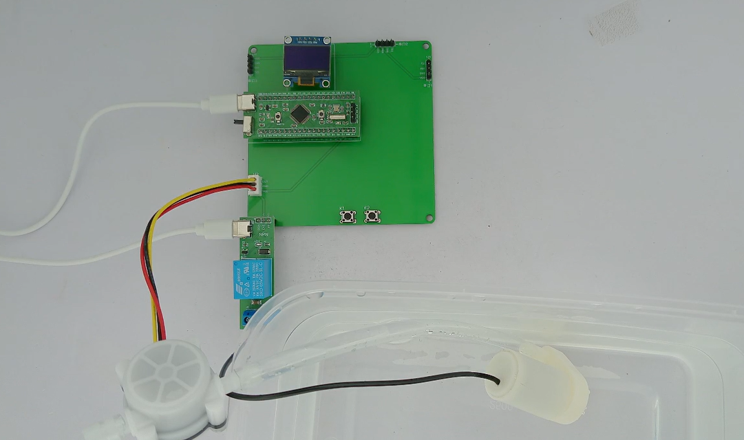 1、通过继电器控制水泵,将水抽出经过流速传感器测出流速,并得出总水流量