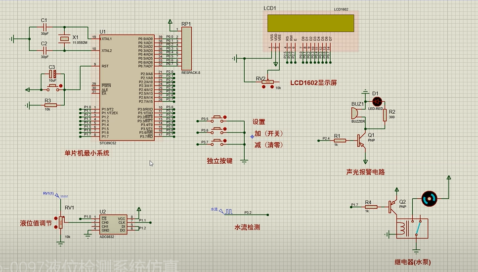 2、通过液位检测模块检测液位值,当液位值小于设置最小值时停止抽水,并声光报警提醒