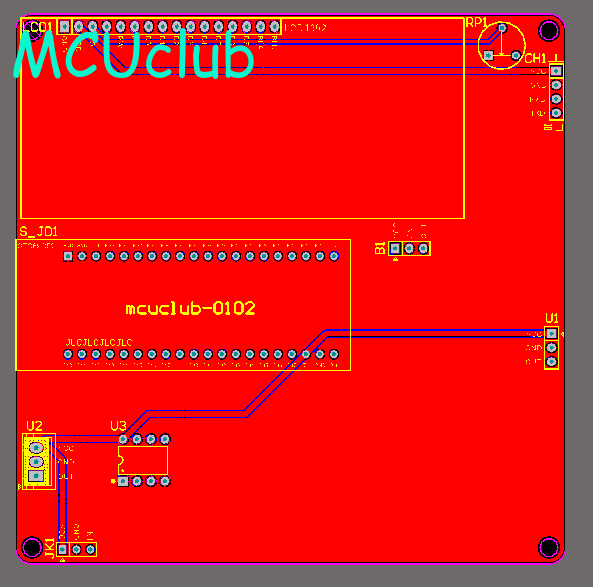 PCB图是由原理图导出,封装很大一部分都是作者自己绘制,不提供封装库,只提供连接好的源文件,可以直接在嘉立创进行打板。两层板,上下覆铜接地。
