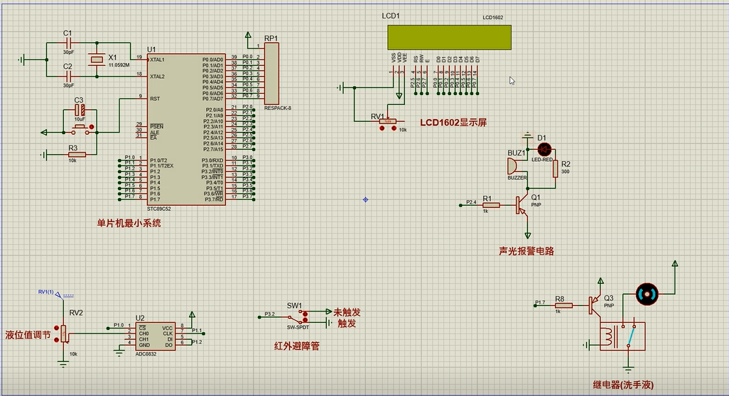 1、通过红外避障管检测是否有人,当有人时,自动挤出洗手液,2s自动关闭