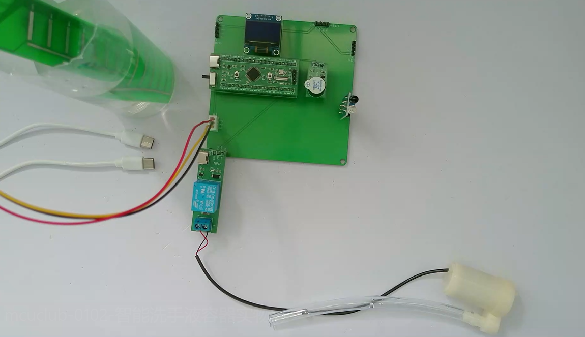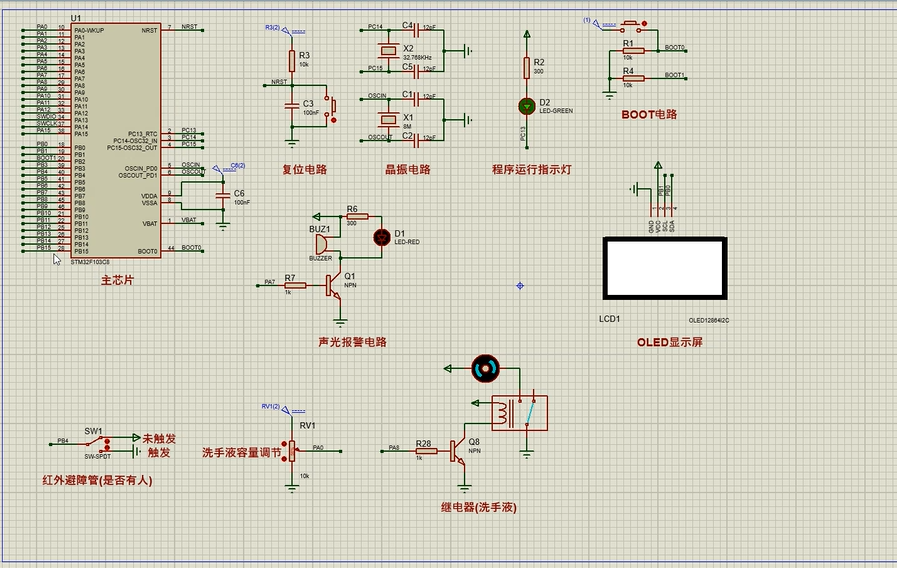 1、通过红外避障管检测是否有人,当有人时,自动挤出洗手液,2s自动关闭