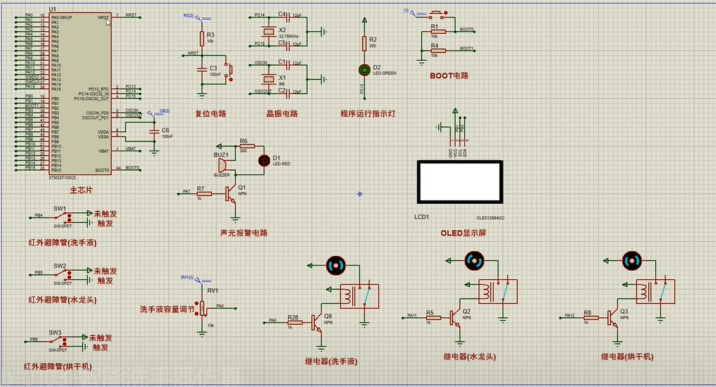 3、通过红外避障管检测水龙头处是否有人,如果有人,开启水龙头出水,直到不触发才关闭
