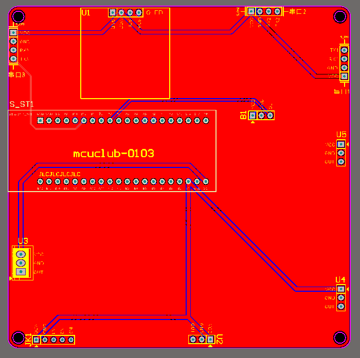 底板:底板在嘉立创进行打板,为绿色PCB板,两层板,厚度1.2,上下覆铜接地。元器件基本上为插针式,个别降压芯片会使用贴片式。