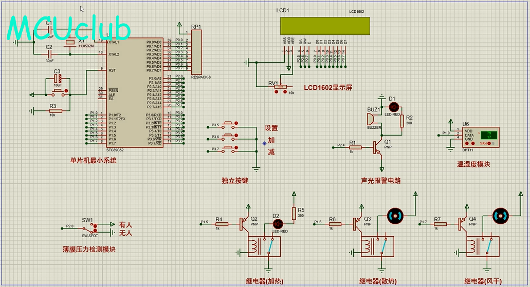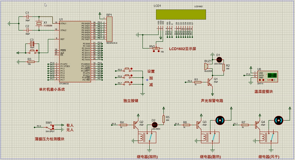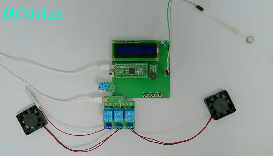 2、通过DHT11检测温湿度,当温度不在设定的范围内,则控制加热和散热,当湿度大于设置最大值(出现汗液),进行风干