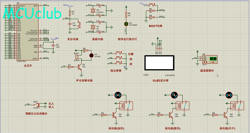 2、通过DHT11检测温湿度,当温度不在设定的范围内,则控制加热和散热,当湿度大于设置最大值(出现汗液),进行风干