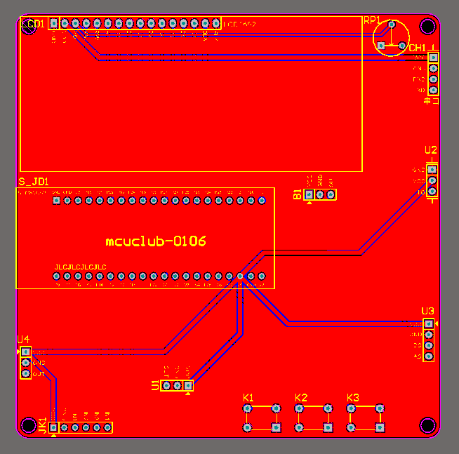 PCB图是由原理图导出,封装很大一部分都是作者自己绘制,不提供封装库,只提供连接好的源文件,可以直接在嘉立创进行打板。两层板,上下覆铜接地。