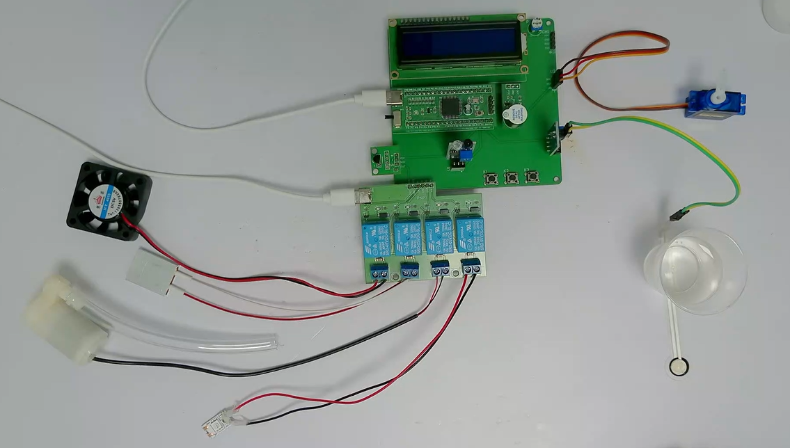 4、通过红外避障检测模块到人离开后,自动关闭马桶盖,并启动冲水(5s),然后启动杀菌(5s)