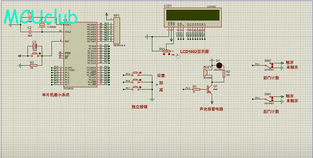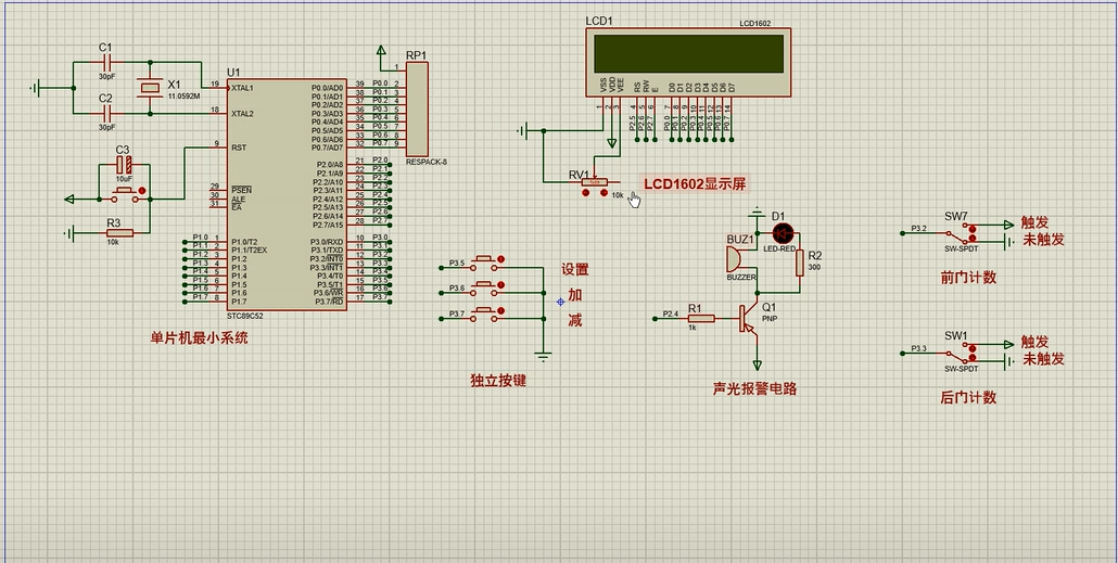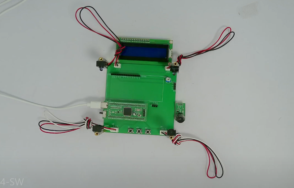 1、通过两对分离式红外对射管模拟前后门计数,车辆超载进行声光报警
