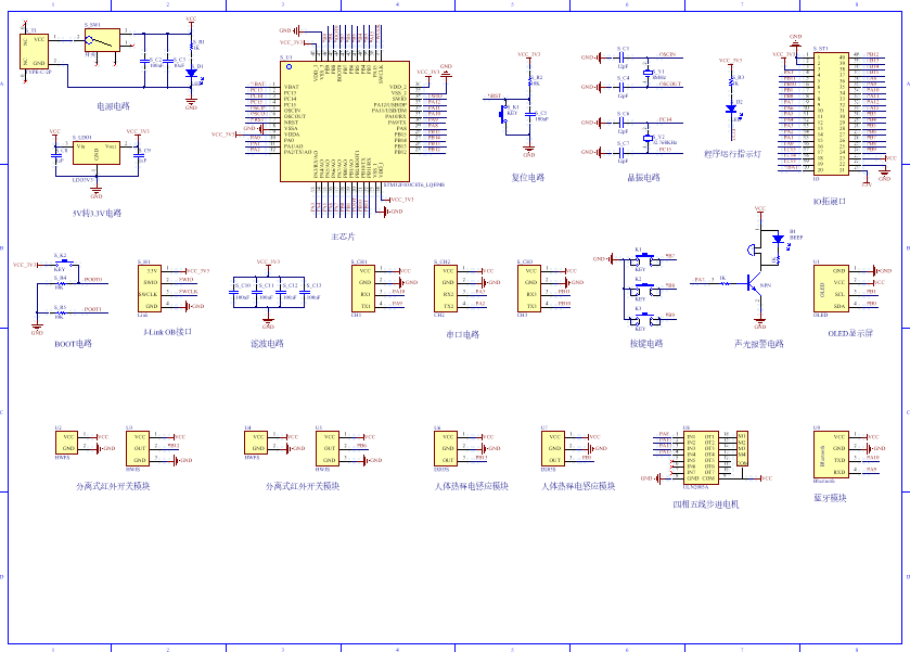 PCB图是由原理图导出,封装很大一部分都是作者自己绘制,不提供封装库,只提供连接好的源文件,可以直接在嘉立创进行打板。两层板,上下覆铜接地。