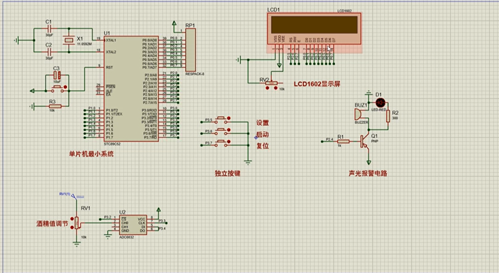 1、通过MQ-3检测酒精浓度,超过设置最大值时,进行声光报警