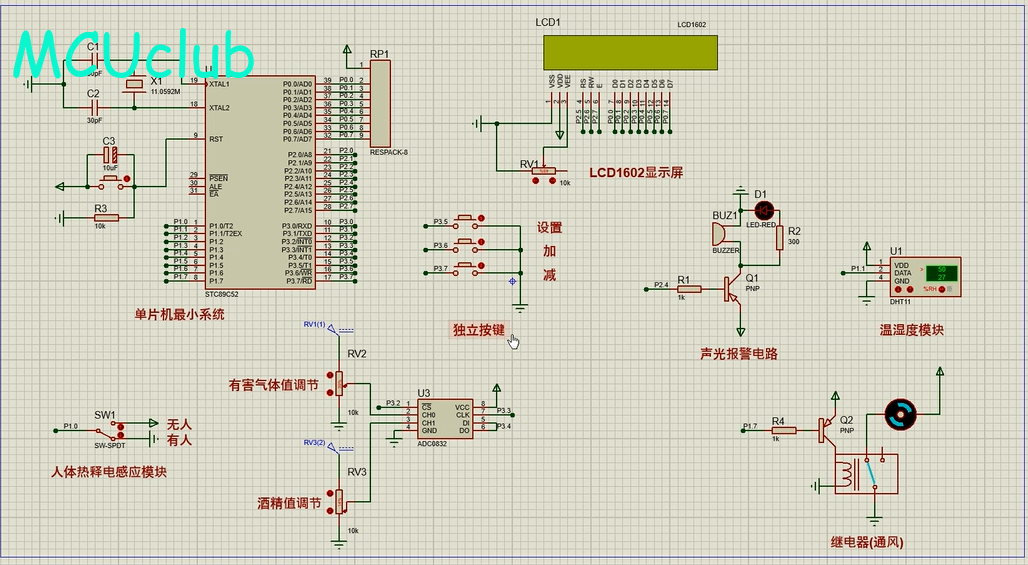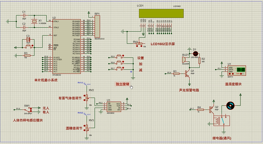 4、通过人体热释电检测是否有人,如果有人,若有害气体浓度大于设置最大值,则声光报警,并自动开启通风系统