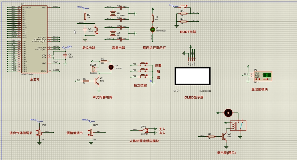4、通过人体热释电检测是否有人,如果有人,若有害气体浓度大于设置最大值,则声光报警,并自动开启通风系统