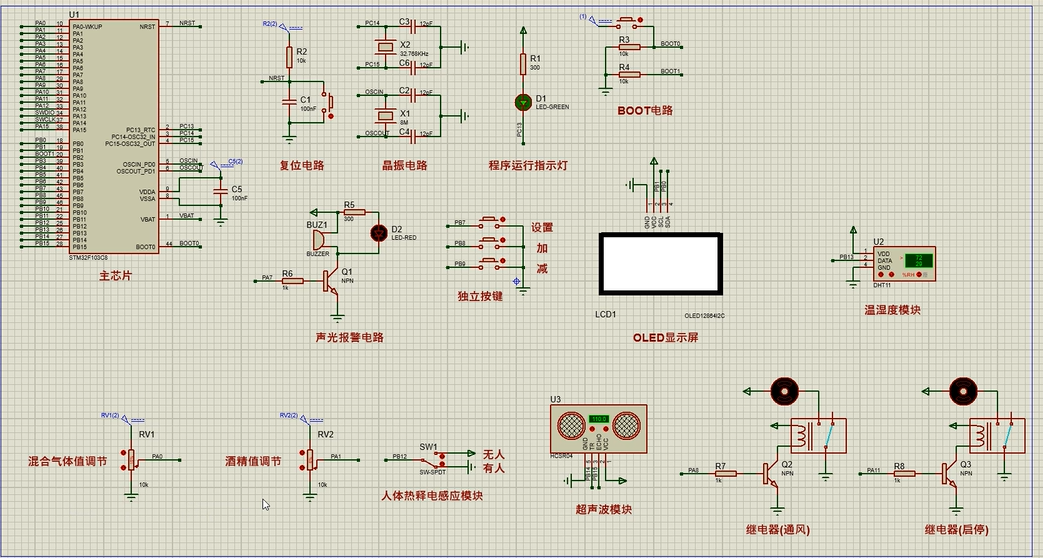 4、通过人体热释电检测是否有人,如果有人,若有害气体浓度大于设置最大值,则声光报警,并自动开启通风系统