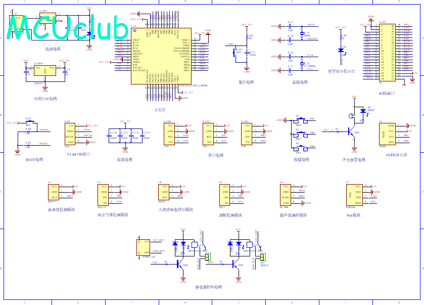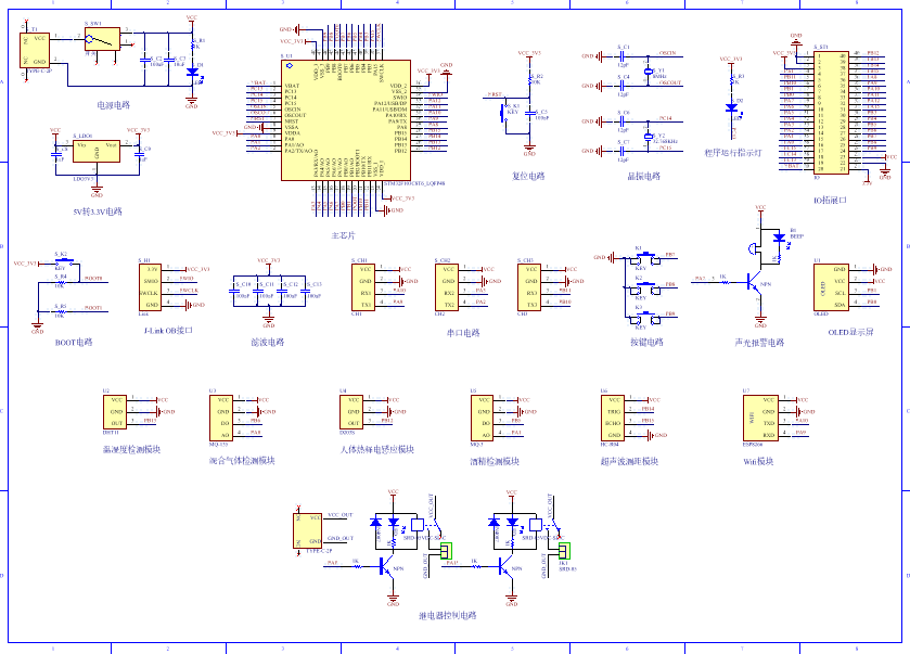 PCB图是由原理图导出,封装很大一部分都是作者自己绘制,不提供封装库,只提供连接好的源文件,可以直接在嘉立创进行打板。两层板,上下覆铜接地。