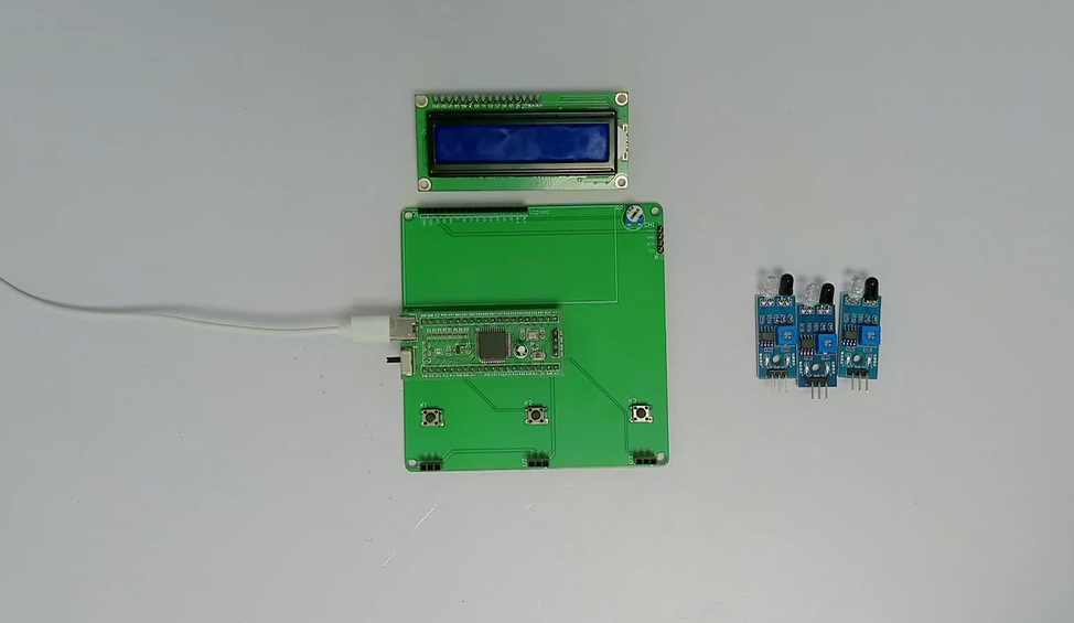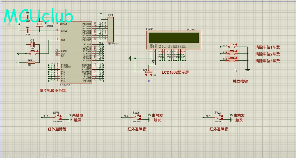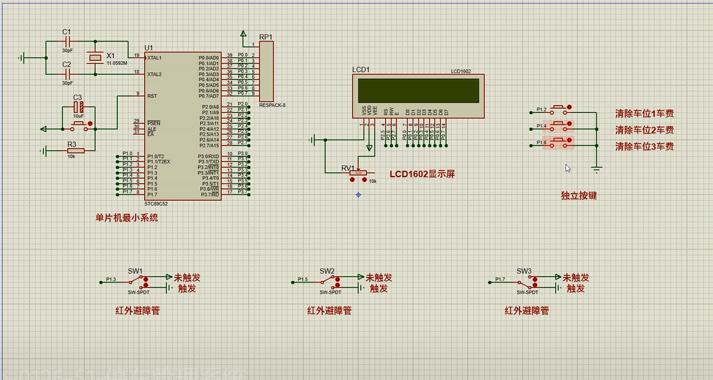 1、通过3个红外避障管检测停车位是否有车,有车时,停车1小时内5元,超过1小时每小时3元