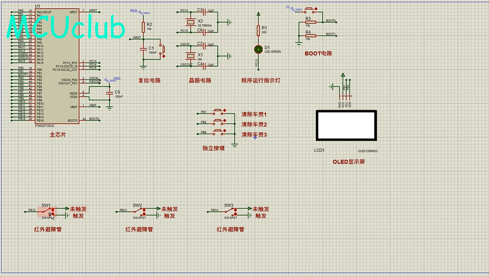 1、通过3个红外避障管检测停车位是否有车,有车时,停车1小时内5元,超过1小时每小时3元