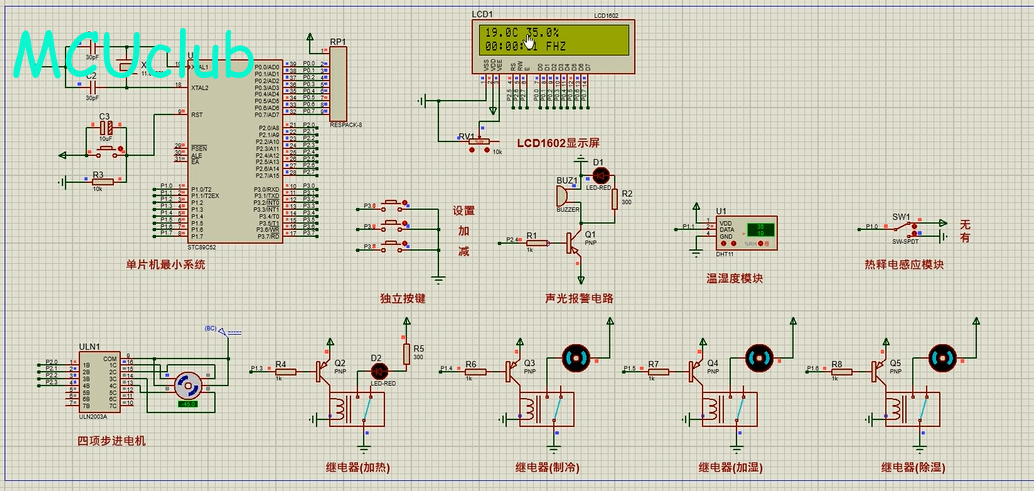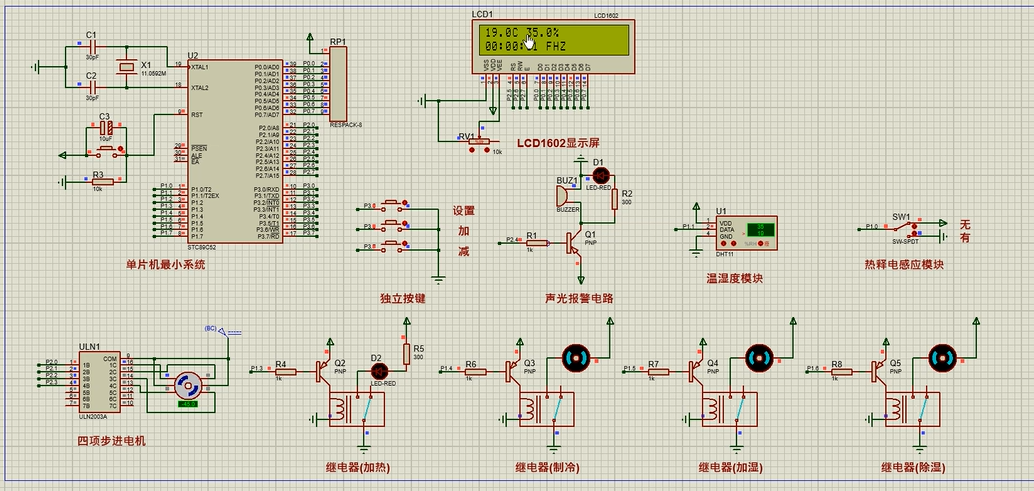 1、通过DHT11检测温湿度,当温湿度值不在设置的上下限值之间,进行加热制冷加湿除湿