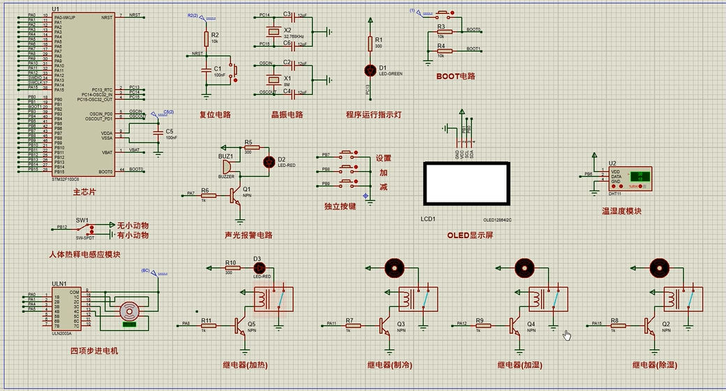 1、通过DHT11检测温湿度,当温湿度值不在设置的上下限值之间,进行加热制冷加湿除湿