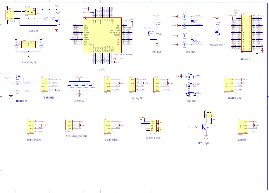 PCB图是由原理图导出,封装很大一部分都是作者自己绘制,不提供封装库,只提供连接好的源文件,可以直接在嘉立创进行打板。两层板,上下覆铜接地。