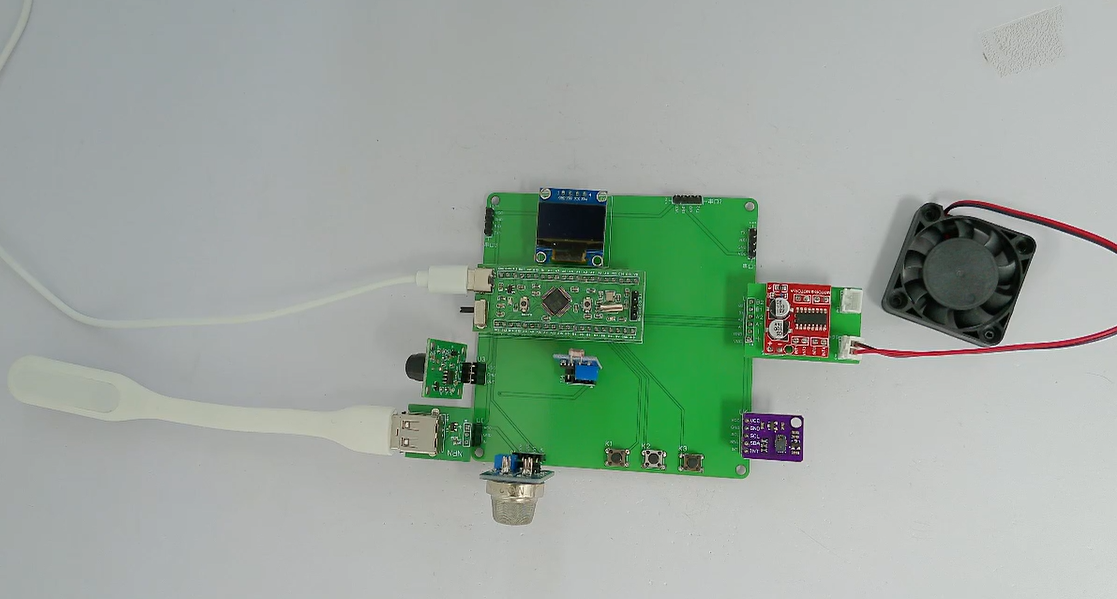 扩展功能:通过蓝牙模块将测量数据发送到手机端,手机端可设置阈值,另外,手机端可远程切换模式、控制风速、开灯