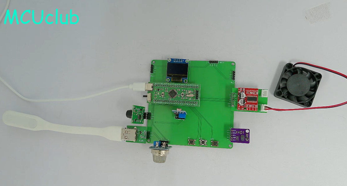 1、通过MQ-2烟雾传感器检测厨房内烟雾浓度,若烟雾浓度小于设定最小阈值,油烟机风扇不工作;若烟雾浓度在设定上下限阈值之间,风扇低速转动;若烟雾浓度在大于设定最大阈值,风扇高速转动