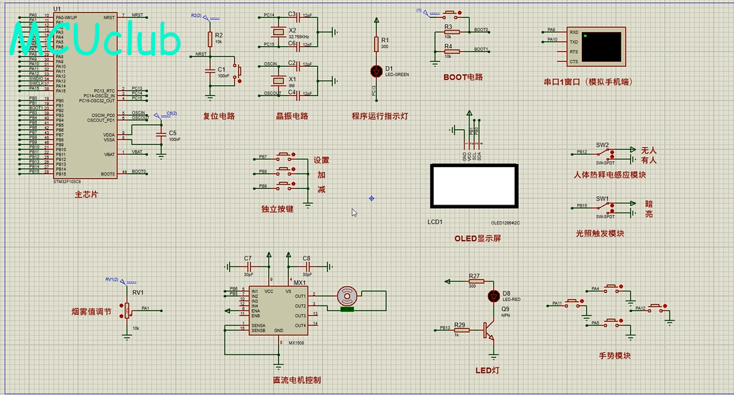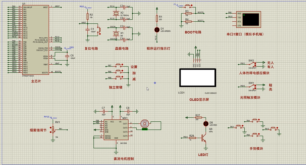注意:部分实物元器件仿真中没有,仿真中会用其他工作原理相似的元件代替,这样可能导致实物程序和仿真程序不一样